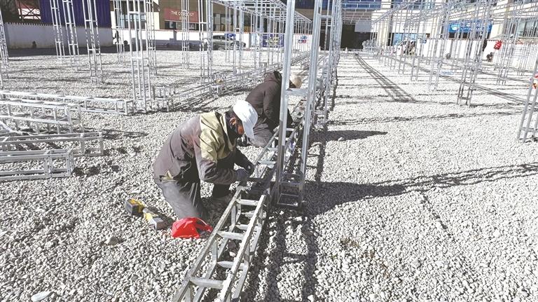 工人正在搭建促銷(xiāo)活動(dòng)場(chǎng)地。記者譚瑞華攝